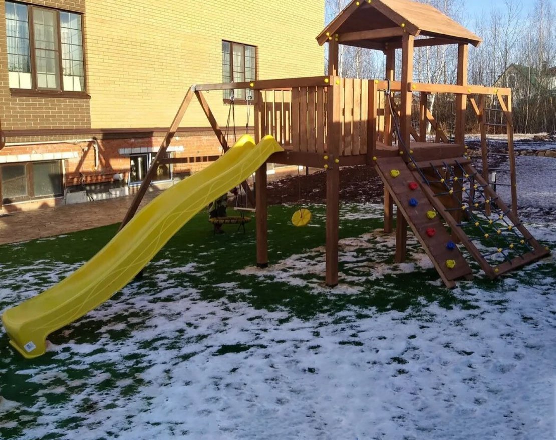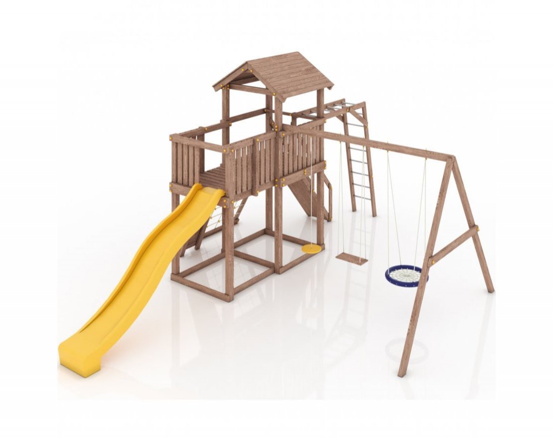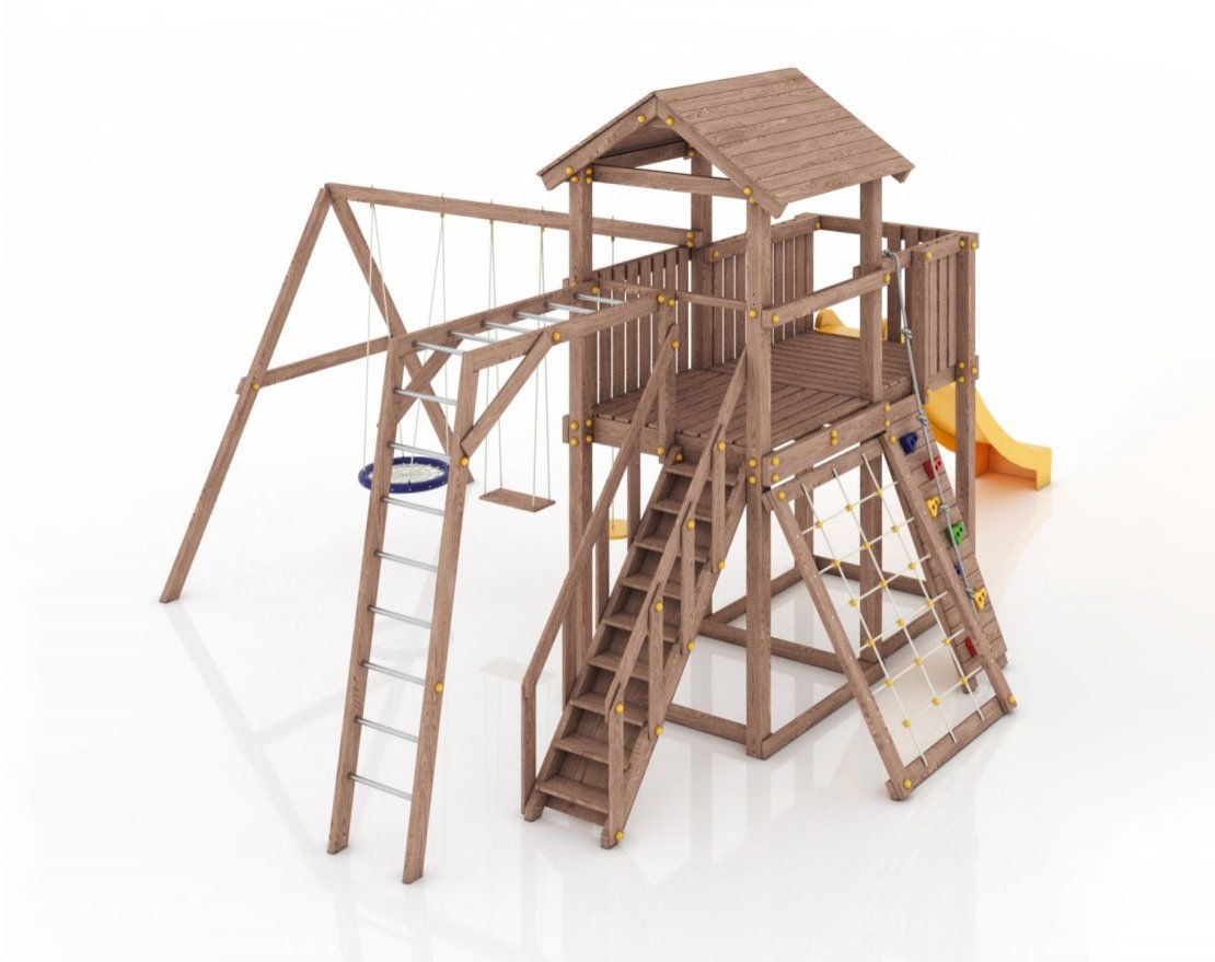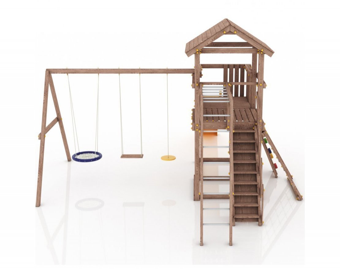 Максимально возможная комплектация в сочетании с качелями-гнездом. Детская площадка в полной комплектации позволит вашим детям разнообразить свои игры на свежем воздухе, а так же пригласить своих друзей для веселого времяпрепровождения. Места хватит всем!