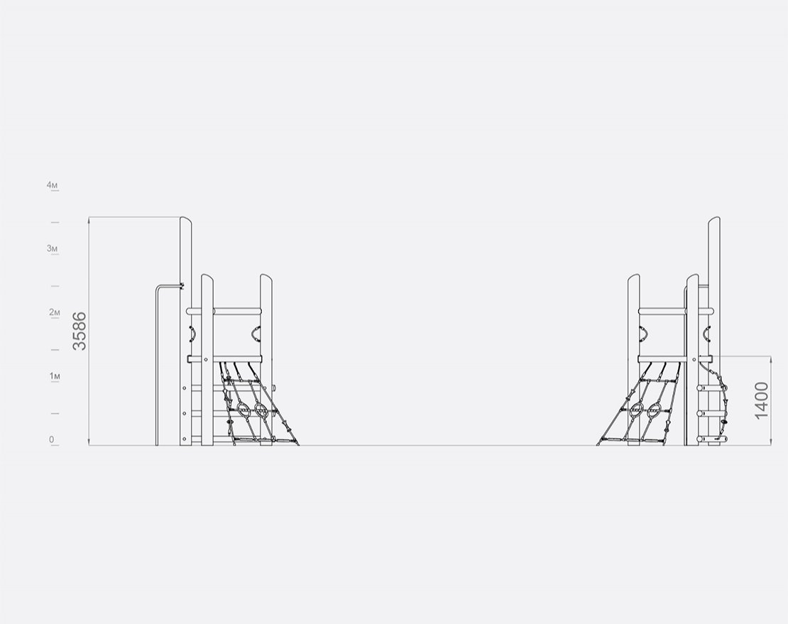 Состоит из опорных стоек, перекладин, металлической трубы-лазалки и канатной сетки. Для большего комфорта, конструкция оснащена пластиковыми уступами и ручками-стропами.