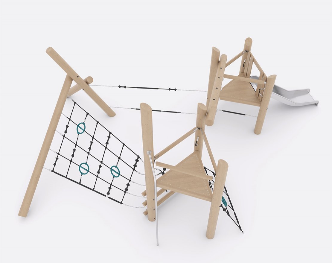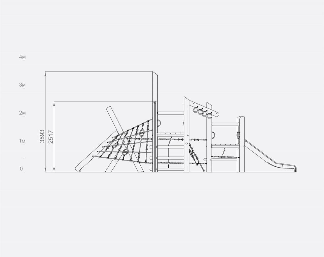 Состоит из опорных стоек, перекладин, канатной сетки и открытой металлической горки с защитными бортиками.