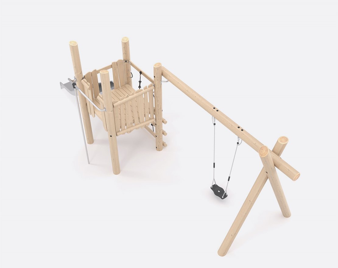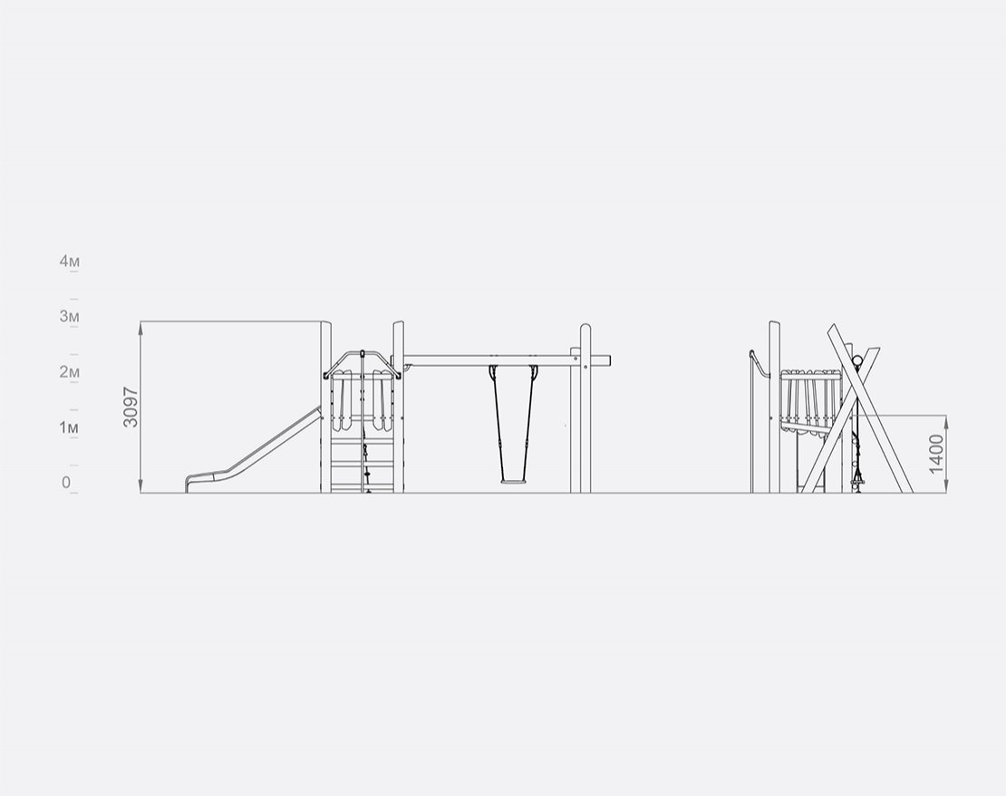 Состоит из опорных стоек, перекладин, металлической трубы-лазалки, открытой горки с защитными бортиками и качели на подвесах. Для большей безопасности, конструкция оснащена ручками-стропами.