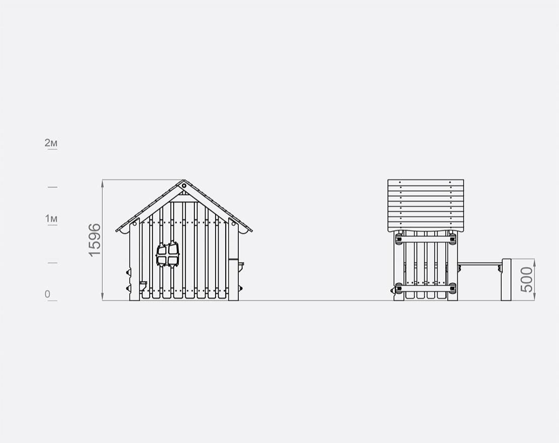 Состоит из опорных столбов и перекладин. Представляет собой домик с крышей, стенками с окном, скамейкой и столиком.