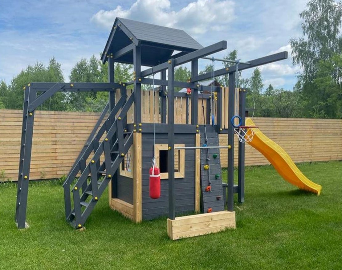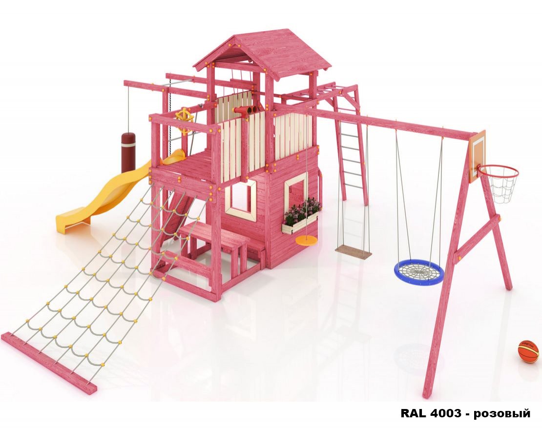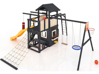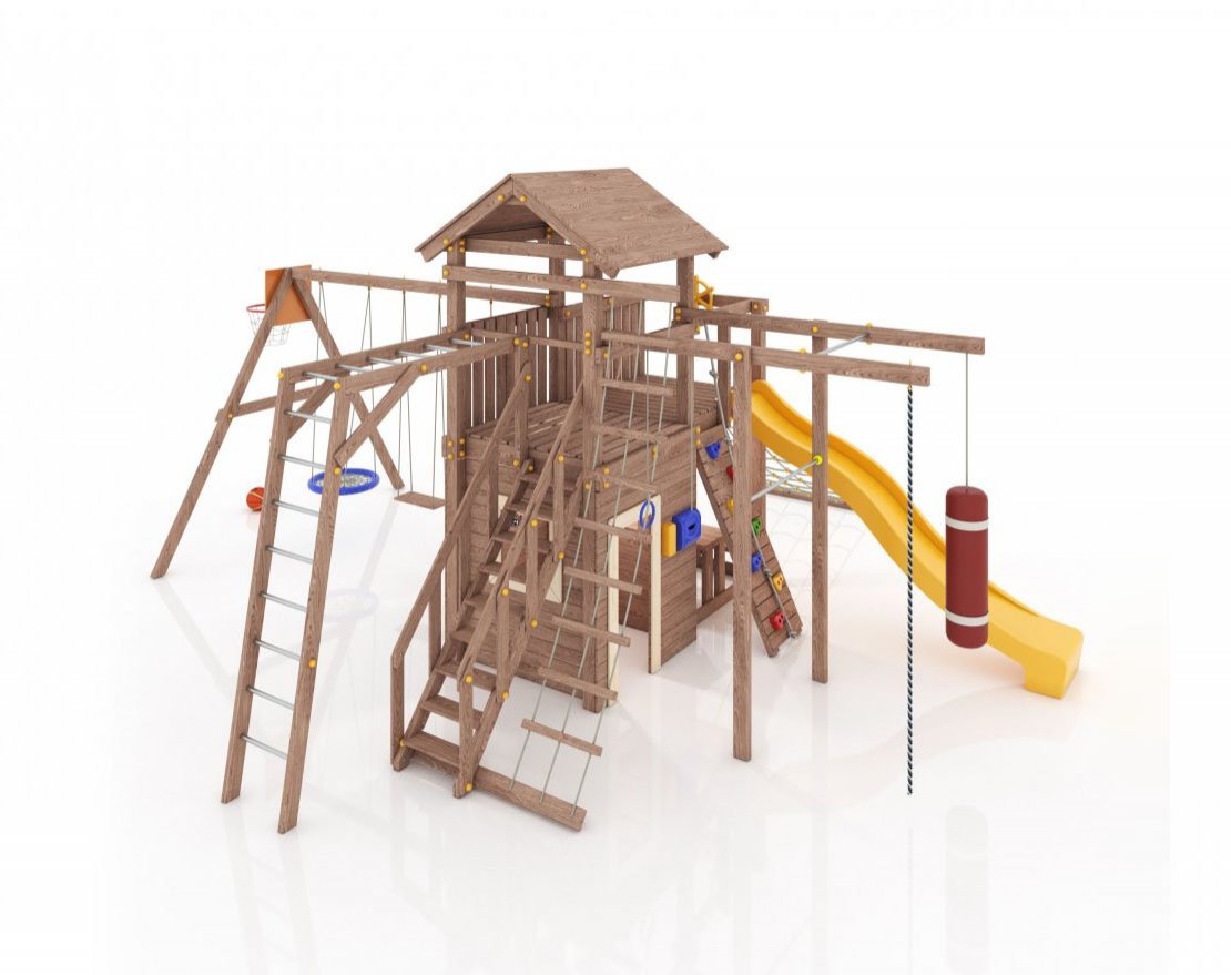 Максимально возможная комплектация в сочетании с турником, скамейками со столиком, домиком с окошками (теремок), в комплекте большая паутинка и пиратская лестница. Детская площадка в полной комплектации позволит вашим детям разнообразить свои игры на свежем воздухе, а так же пригласить своих друзей для веселого времяпрепровождения. Места хватит всем!