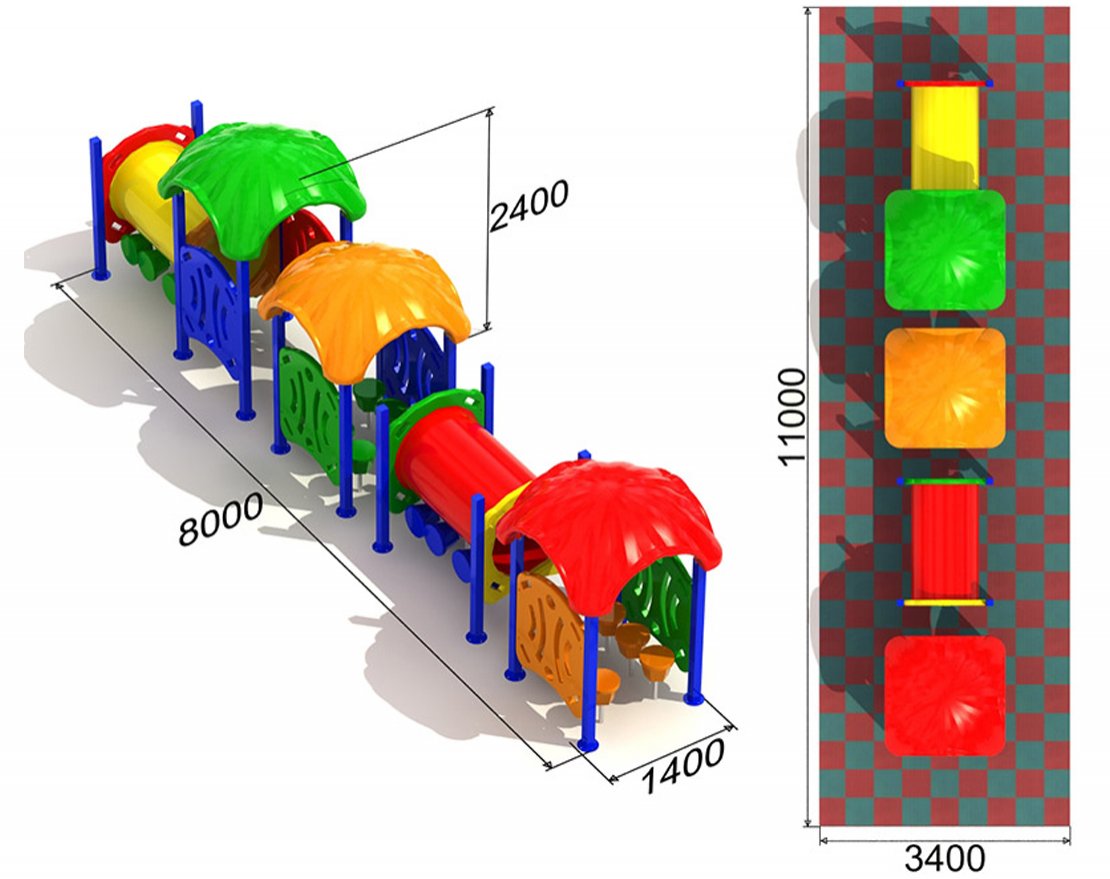 Такой детский комплекс станет настоящим украшением игровой площадки, а благодаря яркому дизайну прекрасно подружится с любым другим игровым оборудованием, будь то песочницы, пластиковые горки или качели.